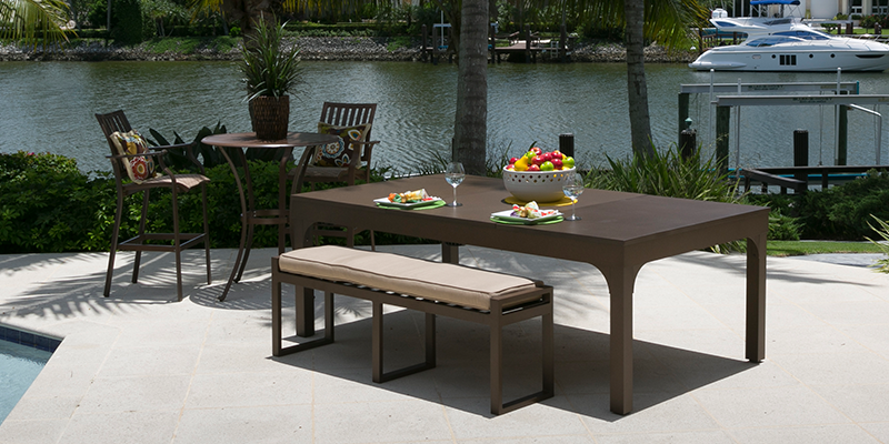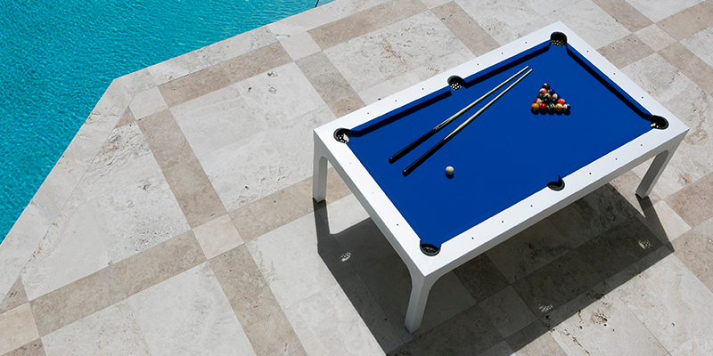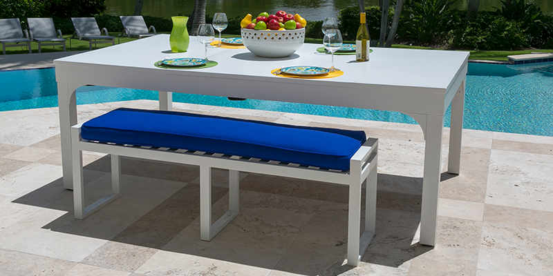 The Balcony Outdoor Pool Table is made from marine grade aluminum and resembles a Parsons style table only a bit thinner in profile. This allows for a full 64” bench which will seat 6 when purchasing the dining package! All R and R outdoor pool tables are fabricated in the metal division of the 250,000 sq. ft. Manufacturing facility in Portland, TN. They are then powder coated off site and quality inspected back at our plant before shipping to you. They feature the Accu-Fast cushion and our Lifetime Warranty. Visit the R and R Website for more information https://randroutdoorfun.com.