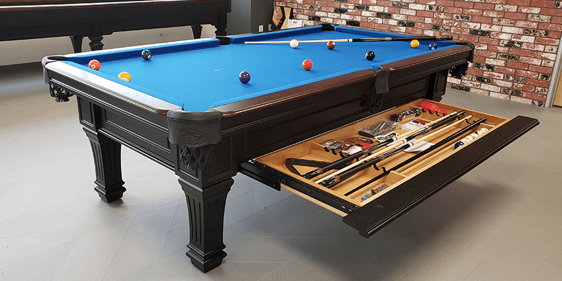 The Kirkwood Pool table is made from Solid Wood and features flat paneled routered cabinet design with classic tapered legs with routered detail. All Olhausen Pool tables are hand-crafted at our 250,000 sq. ft. manufacturing facility in Portland, TN and feature Accu-Fast Cushions and our Lifetime Warranty.
