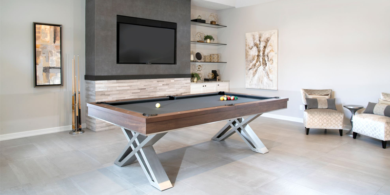 A modern pool table set off by bold stainless-steel legs and comes in a natural walnut finish.